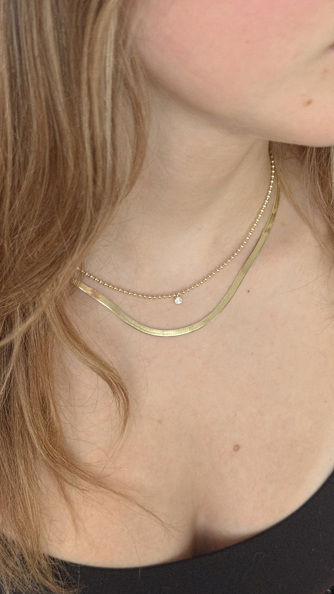 Flowing like ancient tides around your neck, this herringbone chain pairs well with others or stands alone in elegance.